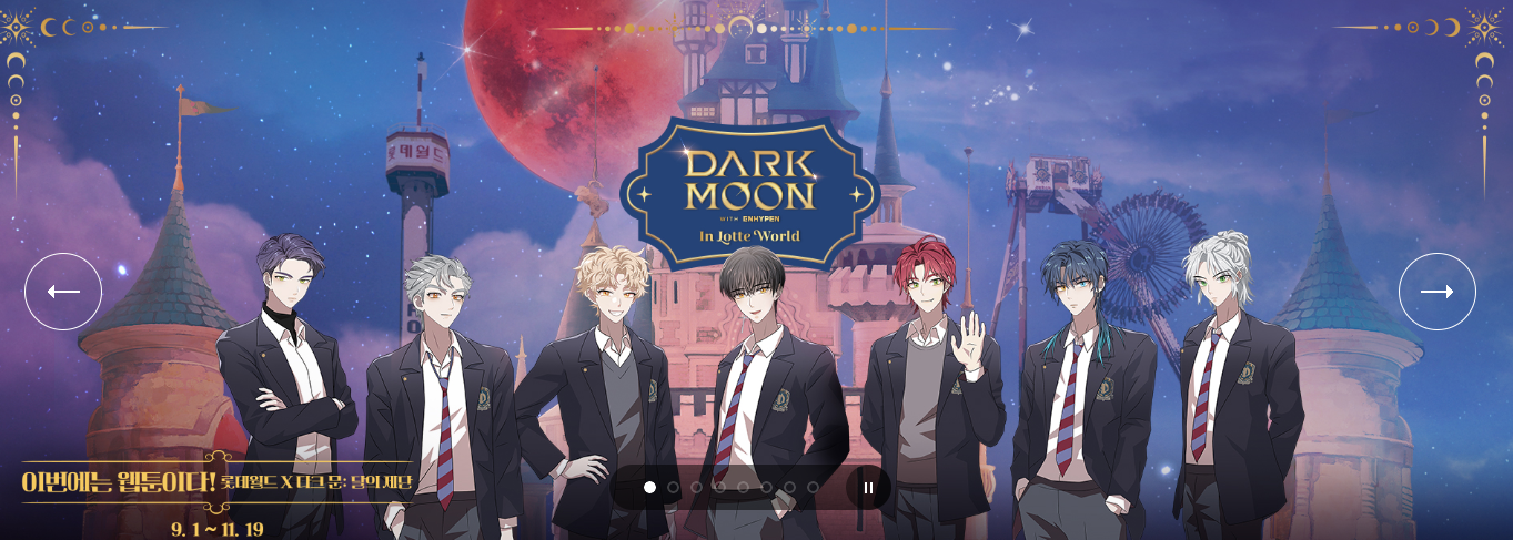 롯데월드도 할로윈 행사로 진행해 오던 호러 할로윈 축제는 임시 중단하고, 아이돌 엔하이픈 웹툰과 콜라보한 "다크문 : 달의 제단" 축제를 진행하고 있습니다.